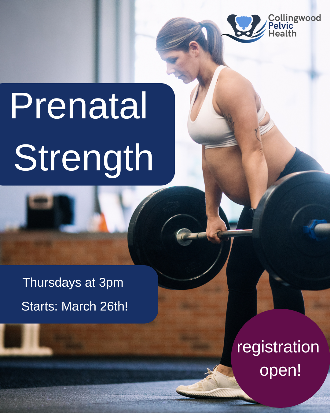 This class is designed for prenatal women who want to stay strong and active throughout their pregnancy and who want a little extra guidance and accountability. . This class is lead by a pelvic health physiotherapist and will run once a week for 6 weeks. Classes are Thursdays at 3pm.